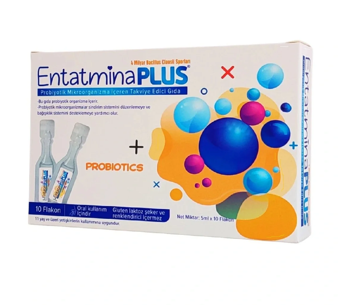 Entatmina Plus Yetişkinler İçin Probiyotik 10 FlakonİÇİNDEKİLER: 5 ml için: Deiyonize Su, Bacillus claussi sporları 4x10 ( 4 milyar ) cfu* Ağız yoluyla içilen sıvı GLUTEN, LAKTOZ VE ŞEKER İÇERMEZ. ORAL KULLANIM İÇİNDİR.