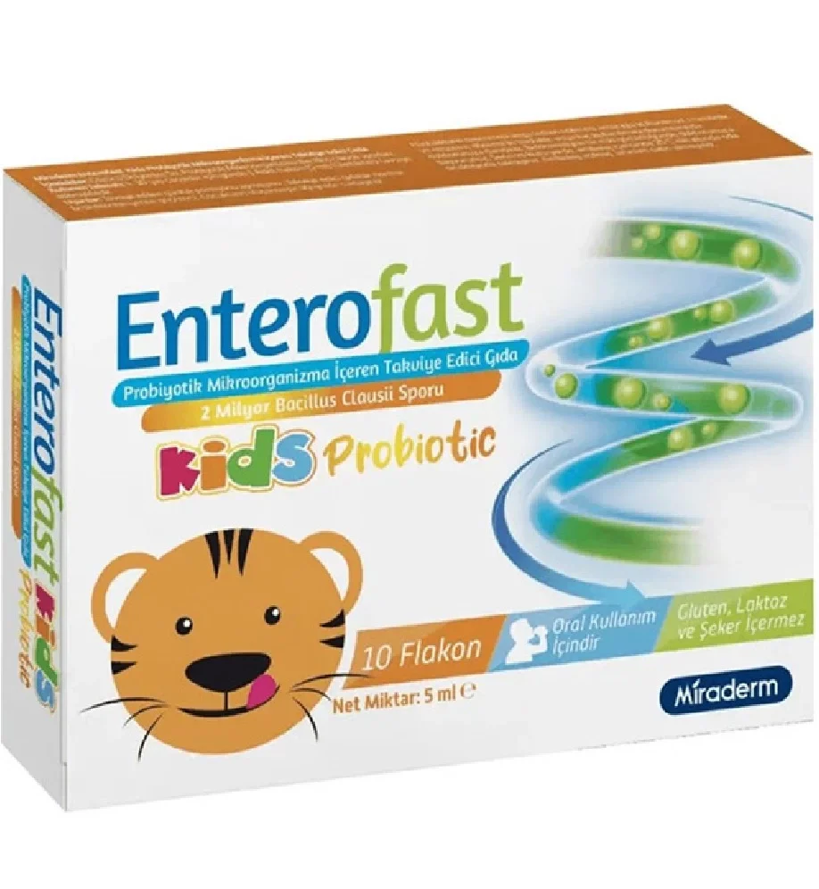 Enterofast Kids Probiotic, çocukların sindirim sistemi sağlığını desteklemek, bağırsak mikrobiyotasını dengelemek ve bağışıklık fonksiyonlarını güçlendirmek için özel olarak geliştirilmiş bir takviye edici gıdadır. Probiyotik mikroorganizmalar, bağırsak florasındaki yararlı bakteri dengesini koruyarak sindirim sorunlarını hafifletmeye, bağışıklık sistemini desteklemeye ve sindirim sonrası gaz, şişkinlik gibi rahatsızlıkları azaltmaya yardımcı olur. Özellikle antibiyotik kullanımından sonra bağırsak dengesinin yeniden kurulmasına katkı sağlar.