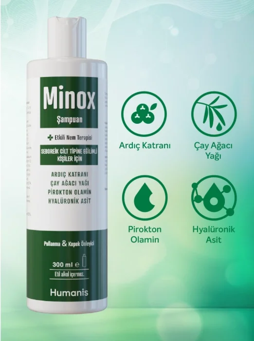 Minox Seboreik Dermatit Şampuan, yağlı cilt tipleri için özel olarak formüle edilmiştir. Ardıç katranı, çay ağacı yağı ve pirokton olamin içeriğiyle saç derisini yatıştırmaya, kaşıntı ve egzama belirtilerini hafifletmeye yardımcı olur. Hyalüronik asit, cildin nem ihtiyacını derinlemesine karşılayarak saç derisine ferahlık kazandırır. Etkin ve nazik bir bakım sunan bu formül, saç derisini dengeler ve sağlıklı bir görünüm kazanmasına katkı sağlar.