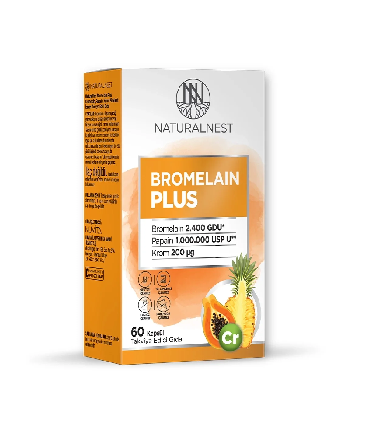 Naturalnest Bromelain Plus, ananas bitkisinden elde edilen doğal bir enzim olan bromelain içeriği ile sindirim sistemine destek olan takviye edici gıdadır. Bromelain; proteinlerin sindirilmesine yardımcı olurken, aynı zamanda bağışıklık sistemini ve vücutta normal inflamatuar sürecin korunmasını destekleyebilir. Formülünde ayrıca sindirim sağlığını güçlendiren yardımcı vitamin ve mineraller bulunur.