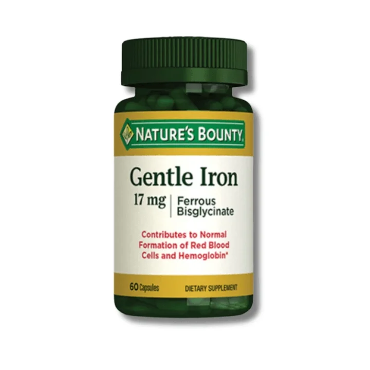 Nature’s Bounty Gentle Iron, demir bisglisinat (şelat) formunda 17 mg elemental demir içerir. Bu patentli taşıyıcı, demiri iki glisin aminoasidiyle moleküler kafese alarak mide pH’ında iyonlaşmasını engeller; böylece sülfat veya fumarat tuzlarına göre yaklaşık %2,5 daha yüksek emilim sağlarken bulantı, kabızlık ve mide ekşimesi gibi yan etkileri minimuma indirir. Demir, hemoglobin ve miyoglobinin yapısında oksijen taşınması ve hücresel enerji üretiminde kritik rol oynar. Yetersiz alım, halsizlik, baş dönmesi, tırnak kırılganlığı ve saç dökülmesine yol açabilir. Klinik veriler, bisglisinat formunda günlük 17 mg demirin 8 haftada serum ferritin seviyesini +15 ng/ml yükselttiğini; hemoglobin değerini +1,2 g/dL iyileştirdiğini göstermiştir.