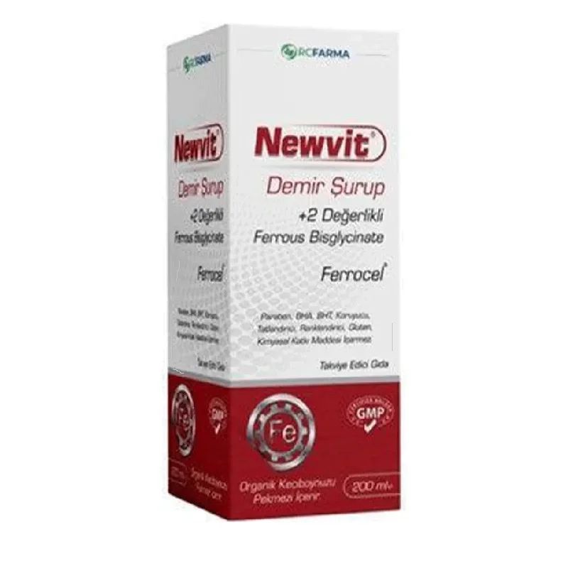 Newvit Demir Şurup, +2 değerlikli demir bisglisinat (yüksek emilimli şelat) ve organik keçiboynuzu pekmezi temelli tatlandırıcı matrisiyle hazırlanmış sıvı formdur. Demir, hemoglobin sentezi ve oksijen taşımada görev alır; eksikliği yorgunluk, baş dönmesi, konsantrasyon bozukluğu ve bağışıklık zafiyetiyle kendini gösterir. Bisglisinat formu bağırsakta serbest iyon salmadan emildiği için kabızlık-mide bulantısı gibi klasik yan etkileri en aza indirir. Çocukluk, hamilelik-laktasyon ve adet dönemi gibi ihtiyaç artışı evrelerinde güvenli deposu sayesinde alyuvar üretimini, zihinsel canlılığı ve kas-doku oksijenasyonunu artırmaya yardımcı olur.