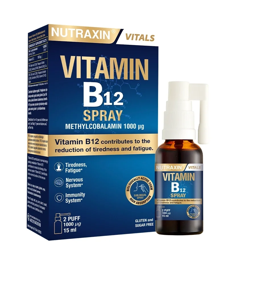 Nutraxin Vitamin B12 sprey, her 2 spreylemede 1000 μg biyolojik aktif form ve yüksek emilime sahip olan metilkobalamin formunu içerir. Vegan ve vejetaryenlerin kullanımına uygundur. Sprey form avantajı ile hızlı ve kolay kullanım sağlar.