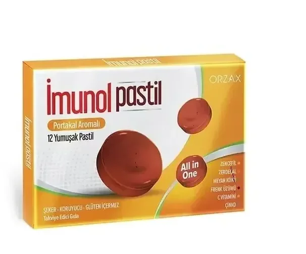 İmunol Pastil – Portakal Aromalı , zencefil, zerdeçal, meyan kökü, frenk üzümü, C vitamini ve çinko içeren portakal aromalı yumuşak formda pastildir. Her kutuda