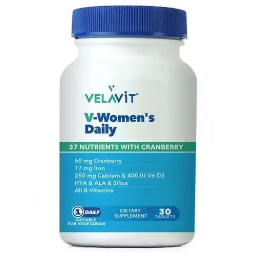 • VELAVİT markasının V-Women's Daily 30 Kapsül'ü, kadınların günlük vitamin ihtiyacını karşılamaya yardımcı olan bir takviye edici gıdadır.