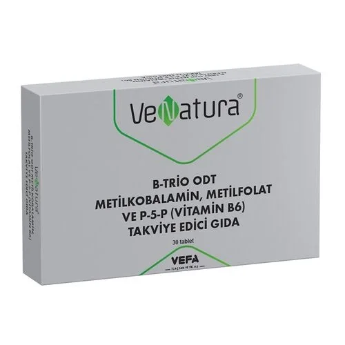 VeNatura B‑Trio ODT, dil üzerinde hızla çözünen (orally disintegrating tablet) formuyla aktif B vitamini eksikliklerinin giderilmesine yönelik geliştirilmiş üçlü bir formüldür. Metilkobalamin (B12) sinir hücrelerinin miyelin kılıfını korur, homosistein seviyelerini dengeleyerek kardiyovasküler sağlığa katkı sağlar ve yorgunluk hissini azaltır. Metillenmiş folat (5‑MTHF) DNA sentezi ve kırmızı kan hücresi yapımını desteklerken, piridoksal‑5‑fosfat (P‑5‑P) formundaki B6 vitamini protein ve nörotransmiter metabolizmasında kilit rol oynar. Üç bileşenin sinerjik birlikteliği, enerji üretiminde, ruh hâlinin korunmasında ve bağışıklık sisteminin normal işleyişinde kritik görev üstlenir. ODT teknolojisi, bağırsak emilimi kısıtlı veya mide asidini azaltıcı ilaç kullanan bireylere yüksek biyoyararlanım sunar.